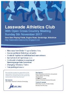 Entries are now open for the Lasswade AC Cross Country, on entry central for seniors and vets. The event takes place at Gore glen Playing Fields, Gorebridge on Sunday 5th November. Races are held for age groups U11 up to seniors / vets. By booking in advance, on entry central, athletes will benefit from a discount on the on the day price.